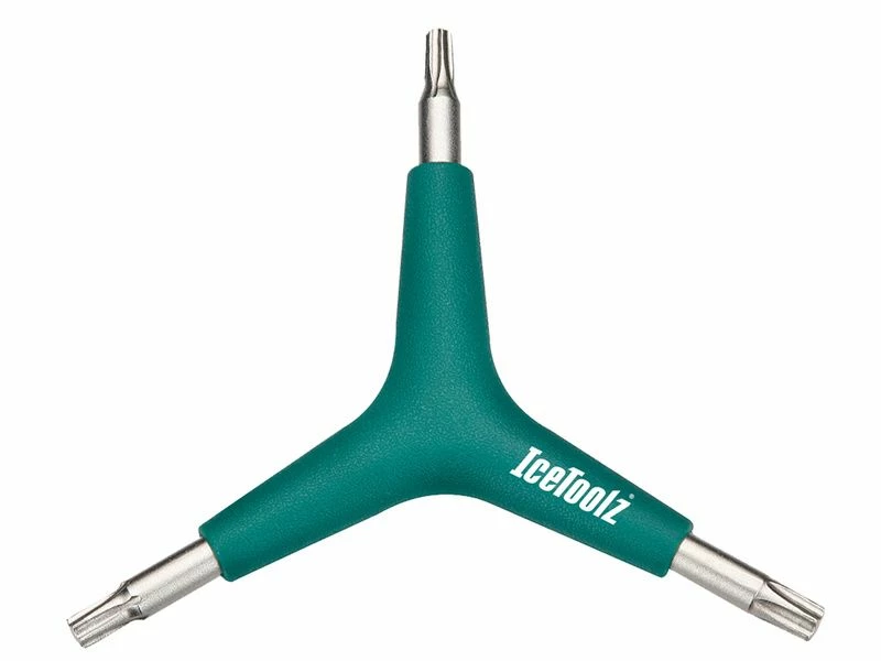 Clé en Y IceToolz comprenant 3 embouts Torx T25, T30 et T40. Elle recouverte d’un grip en Kraton très confortable.