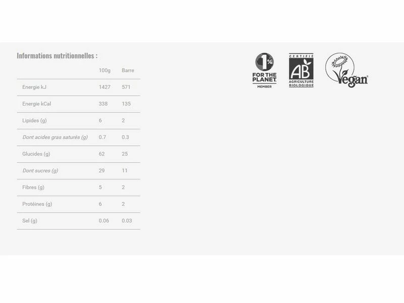 - Abricot 32%, Sirop de riz, Farine d’avoine 16%, Noix 7%, Riz soufflé (Farine de riz, sucre, extrait de malt, huile de tournesol, Lecithine de tournesol) 7%, Avoine 4%, Farine de soja, Eau, Amarante soufflée 1%, Huile de tournesol
