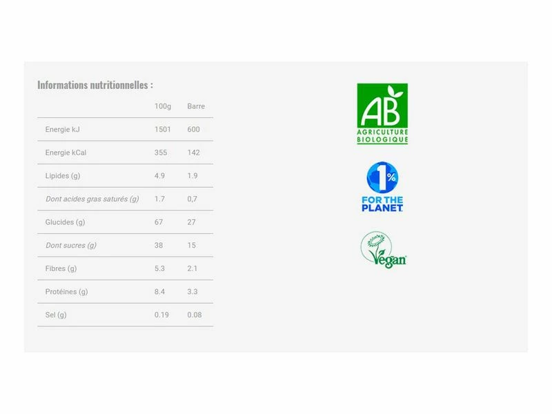 - Cette barre fabriquée à base d’ingrédients naturels peut contenir des petits morceaux de coquilles ou d’écorces.