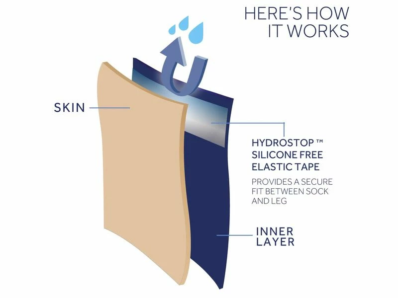 Il convient de noter que certaines personnes peuvent ressentir une légère irritation cutanée due au frottement de la barrière Hydrostop contre la peau. Pour ceux qui ressentent ce type d’irritation, nous recommandons d’utiliser les chaussettes Hydrostop uniquement à l’extérieur et non pendant une période prolongée